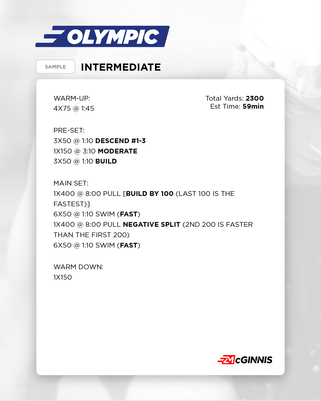 Intermediate: Main sets follow a 2:00 per 100-yard interval. Athletes should be able to complete 7×100s on a 2:00 interval and hold under 1:50 per 100. This group typically includes former high school swimmers and experienced Masters swimmers or triathletes.